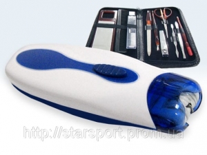 Работает от 2-х батареек типа ААА, в комплект они не входят. В комплект входит маникюрный набор.