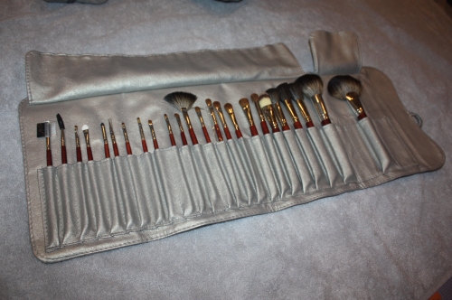 За счет этого кисти удачно набирают косметические средства не перерасходуя декоративную косметику. По мимо кистей также входит серый чехол с ячейками под каждую кисть. Завязывается на веревки. При частом использовании, это предотвращает вырываение кнопок (как часто бывает в других наборах )
