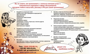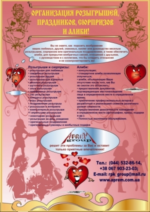 Агентство с полным спектром услуг и комплексным подходом в сфере обслуживания, организации различных праздников любого масштаба, рекламы, розыграшей, сюрпризов, алиби и PR.1. Разработка концепции Event (Организация мероприятий)• Подбор места для проведения мероприятий• Шоу-программа• Букинг артистов (приглашения разного рода артистов как Украины так и зарубежжя в качестве участника Вашего мероприятия.)• Оформление• Техническое обеспечение• Кейтеринг• Конференц-сервис• Фейерверки, салюты, пиро-шоу и многое другое• Транспортные услуги• Фото и видео съемка• Оригинальные подарки2. Разработка концепции рекламной кампании• маркетинговые исследования• проведение промо-акций• PR-поддержка рекламных кампаний• анализ эффективности рекламных кампаний• мотивационные программы, направленные на повышение продаж (для продавцов, мерчендайзеров)• медиа реклама (ТВ, радио, пресса, интернет, полиграфия, сувенирка, наружная реклама, реклама в супермаркетах, BTL и других)3. Выставки• тентовые конструкции, монтаж и демонтаж• выставочные стенды, проектирование, монтаж и демонтаж• обслуживание стенда во время выставки• также: тепловые пушки, обогреватели, напольное покрытие, подиум, сцена, звуковое оборудование, освещение, декорирование тентовой конструкции, гардеробные, брендирование4. Дизайн и верстка печатных изданий• разработка дизайна под печать • офсетная, цифровая, лазерная печать (специализация: корпоративная и рекламная продукция, деловая полиграфия).5. Наружная реклама• широкоформатная печать;• вывески и архитектурные проекты• световая реклама, газосветная реклама (неон, короба)6. Компьютерная графика и анимация• съемка корпоративных фильмов, рекламных роликов• технологическое 3D моделирование и анимация• разработка компьютерных CD презентаций с использованием 3D технологий• DVD и CD мастеринг• Медиапланирование7. Дизайн и визуализация• Разработка фирменного стиля (брендбук)• создание макетов• фотоработы8. Интернет-технологии, интернет-реклама• Администрирование и поддержка работы сайта• Контент-менеджмент, создание текстов для сайтов• Разработка сайтов, web дизайн • Раскрутка сайта и продвижение в Интернет• Реклама в Интернет (Интернет-реклама). Интернет-маркетинг• Разработка баннеров, презентаций, анимации для интернет9. Организация розыгрышей, праздников, сюрпризов и алиби!Вы не знаете, как поразить воображение ваших любимых, друзей, знакомых, коллег или руководство веселым розыгрышем, сюрпризом или оригинальным поздравлением, а также обеспечить алиби, для прикрытия внебрачных связей, отношений с друзьями, с руководством и с коллегами, что бы сгладить отношения и не скомпрометировать их!Розыгрыши и сюрпризы:• розыгрыши для любимых• свадебные розыгрыши• розыгрыши друзей• розыгрыши для взрослых• веселые розыгрыши• шуточные розыгрыши• злые розыгрыши• телефонные розыгрыши• смс розыгрыши• конкурсы розыгрыши• игры розыгрыши• поздравление розыгрыш• розыгрыши в интернете• компьютерные розыгрыши• 1 апрельские розыгрыши• новогодние розыгрыши• розыгрыши на день рождения• оригинальные поздравления• оригинальные сувениры и необычные подарки10. Алиби:• консультация;• стандартное алиби позволяющее отлучиться;• алиби, объясняющие Ваше отсутствие после того, как Вы не смогли это объяснить; 