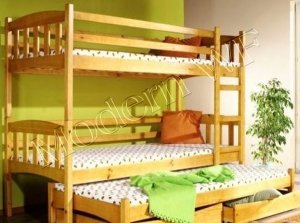 Кровать «Трио» Размеры спального места нижнего яруса: Ширина: 90см. Длина: 190см. Размеры спального места верхнего яруса: Ширина: 90см. Длина: 190см. Размеры спального места дополнительной кровати: Ширина: 90см. Длина: 182см. (толщина матраса до 20см.) Габаритные размеры: Ширина: 100см. Длина: 200см. Высота: 180см. Кровать раскладывается на три кровати. Кровать с выдвижными ящиками на направляющих под дополнительной кроватью. Доп. кровать на колесиках. В основании кроватисосновые лаги, ламели. Материал изготовления: сосна, ольха, ясень, дуб.