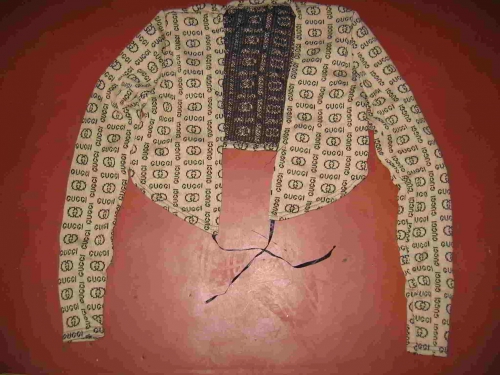 На бежевом фоне черный буквенный узор "GUGGI". В наличие 1 шт.