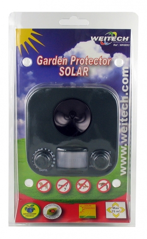 Ультразвуковой отпугиватель собак, кошек, куниц, зайцев, лисиц и прочих животных. Работает от световой энергии, благодаря наличию солнечной батареи. В устройстве вмонтирован датчик движения.Weitech WK-0053 отпугивает животных с вашего участка по сигналу от датчика движения, регистрирующего какое-либо перемещение, сразу же срабатывают световой и ультразвуковой отпугивающие сигналы. Изделие хорошо зарекомендовало себя на открытых участках, в садах, огородах, клумбах.Технические характеристики:Площадь воздействия: 75 кв.м.Питание: Солнечная батарея (панель) и 2шт. NiMH аккумуляторыРадиус воздействия: 120 град. (до 7-ми метров по прямой)Динамик: 51 мм в диаметреРазмеры В*Ш*Г: 10,5 х 11,5 х 5 смРегулировки и настройкиЛевая Кнопка: Регулирование чувствительности инфракрасного датчика движенияПравая Кнопка: Выбор частоты (14 - 25 КГц)