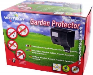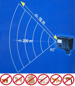 Предназначен для отпугивания собак, кошек, лис и других животных. Отпугиватель имеет в своем составе инфракрасный датчик движения. Защищает до 200 м² Прибор WK-0051 («Защитник дворов») предназначен для отпугивания собак, кошек, лис и других животных.Отпугиватель имеет в своем составе инфракрасный датчик движения, который регистрирует появление в защищаемой зоне животных. По сигналу от датчика «Защитник дворов» подает акустический сигнал определенного диапозона частот в зависимости от положения регулятора. Всего предусмотрено 7 диапазонов. Каждый последующий диапазон включает в себя также все сигналы предыдущих диапазонов.Сигнал подается в течении 7 секунд, после чего следует пауза в 5 секунд. Если движение не прекратилось, прибор вновь включается автоматически.Прибор питается от 4-х батареек типа «D». Одного комплекта качественных батареек достаточно для 5000 срабатываний.Защищает до 200 м²Угол обзора датчика движения — 90°