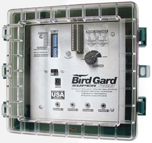 Отпугиватель птиц Bird Gard Super Pro является современной разработкой американских ученых. Принцип работы прибора основан на качественном цифровом воспроизведении криков тревоги и бедствия отпугиваемых птиц, а также их естественных врагов — хищников.Предназначен для отпугивания любых видов птиц, за исключением врановых (ворон, галка, грач).Сменная память прибора содержит 8 различных цифровых записей голосов птиц. Набор данных записей может быть изменен в зависимости от орнитологической обстановки и поставленной заказчиком задачи.Площадь защищаемой территории — до 2,4 га.В комплект прибора входят:– блок управления;– 4 динамика;– адаптер питания от сети 220 Вольт;– кабель для подключения к аккумуляторной батарее с клипсами.Возможно включение в комплект солнечных батарей, кожухов для динамиков.