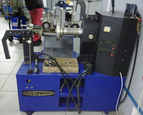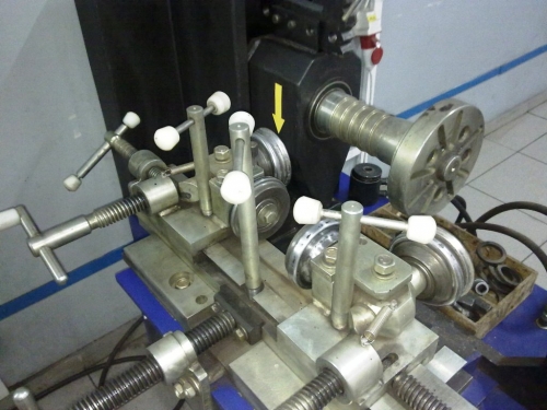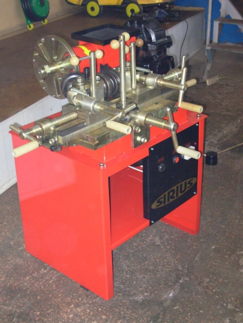 Оборудование для правки и рихтовки дисков (Украина) Станок позволяет восстановить профиль посадочных мест под установку шины, устранить эллипсность, радиальное и осевое биение диска автомобильного колеса без приложения значительных физических усилий. Рихтовка производится методом одновременной или последовательной двухсторонней прокатки наружной и внутренней части диска стационарными и поворотными роликами. Стенд укомплектован резцом для подрезки кромки диска. Установка диска на шпинделе осуществляется на отверстия крепления, что позволяет производить рихтовку по схеме закрепления колеса на ступице автомобиля. Дископравильный станок оборудован двумя планшайбами с пазами количеством 4,5,6 штук под крепежные отверстия дисков количеством 4,5,6 штук соответственно. Вращение осуществляется от трехфазного электродвигателя через клиноременную передачу и червячный редуктор Ч 100