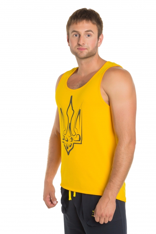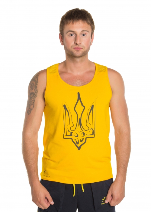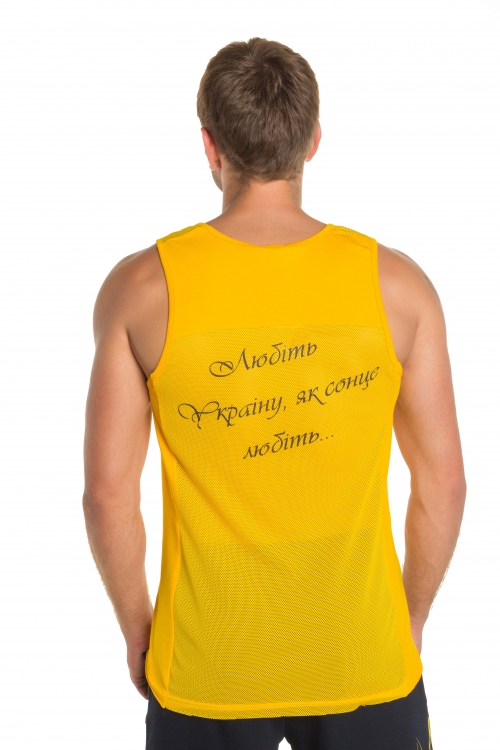 Желтая мужская майка с изображением украинского герба и цитатой сзади из стихотворения Владимира Сосюри придется по душе всем истинным патриотам.