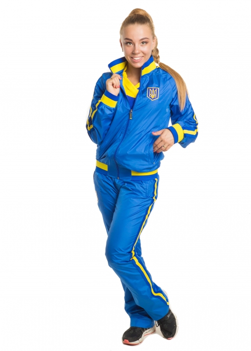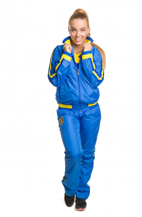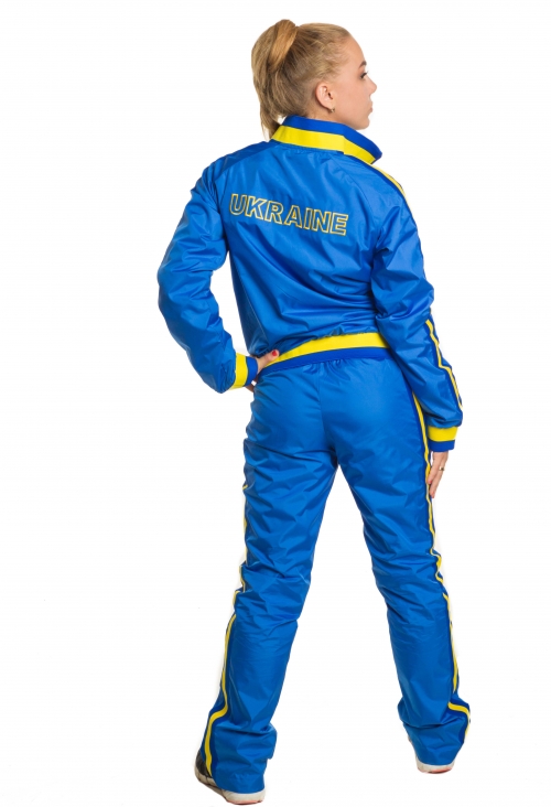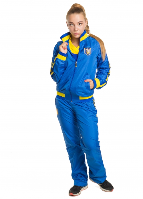 Стильный и удобный спортивный костюм из ветровки и спортивных штанов. Изготовлен из тонкой плащёвой ткани высокого качества, практичной в уходе и носке. Пояс штанов на резинке и регулирующем шнурке. Изделие декорировано вышивкой герба Украины, надписью Ukraine, а также фирменной тесьмой по бокам рукавов и по бокам брюк. Низ куртки и манжеты рукавов выполнены из эластичной резинки в государственных цветах Украины.