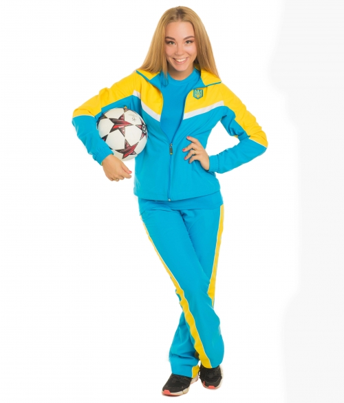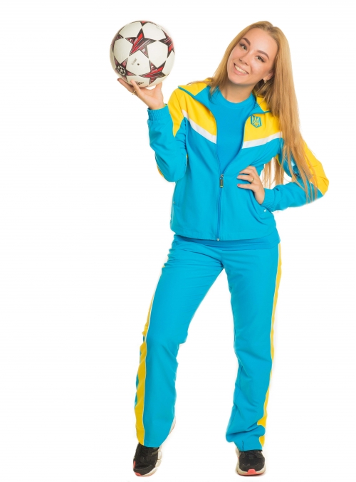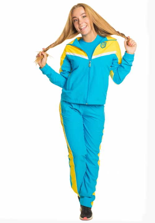 Прекрасный спортивный костюм, состоящий из мастерки и брюк. Костюм изготовлен из мягкой приятной на ощупь ткани с подкладкой из спортивной трикотажной сетки, позволяющей коже дышать. Мастерка с застежкой на молнию и втачными карманами декорирована вышивкой герба Украины по переду и вышивкой надписи Ukraine по спинке. Низ мастерки по спинке выполнен в интересной полукруглой форме. Брюки прямого покроя с втачными карманамии поясом на резинке украшены контрастными вставками, подчёркивающими изящество женской фигуры.