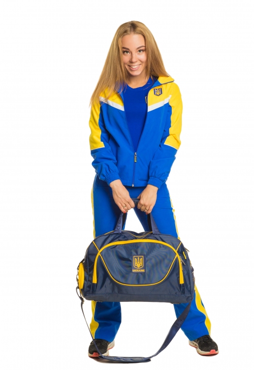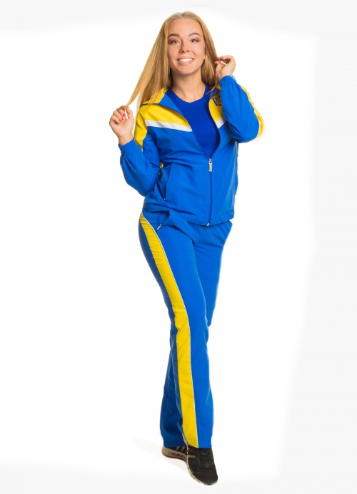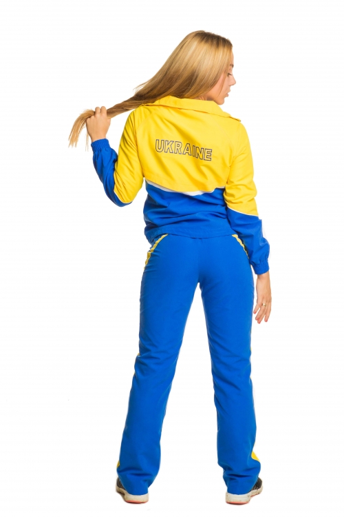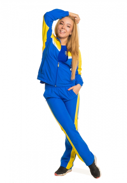Прекрасный спортивный костюм, состоящий из мастерки и брюк. Костюм изготовлен из мягкой приятной на ощупь ткани с подкладкой из спортивной трикотажной сетки, позволяющей коже дышать. Мастерка с застежкой на молнию и втачными карманами декорирована вышивкой герба Украины по переду и вышивкой надписи Ukraine по спинке. Низ мастерки по спинке выполнен в интересной полукруглой форме. Брюки прямого покроя с втачными карманамии поясом на резинке украшены контрастными вставками, подчёркивающими изящество женской фигуры.