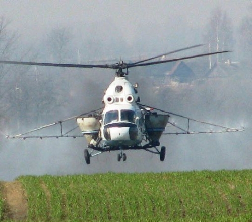 Внесение гербицидов проводится вертолетами Ми-2 с максимальной нормой внесения рабочей жидкости 100 литров на гектар.