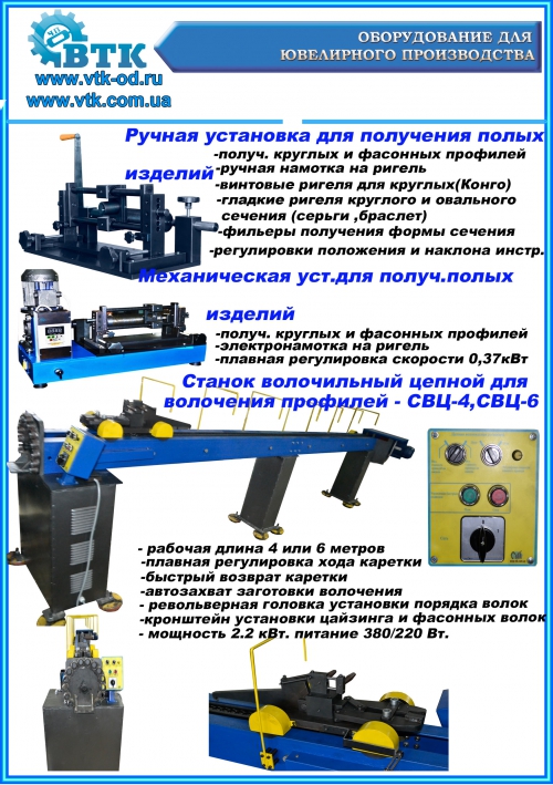 Устройство предназначено для изготовления полых изделий различной конфигурации путем протяжки сквозь фильеру и одновременной намотки на ригель. Ригеля применяются различной формы: 1) винтовой ригель, используется для намотки изделий круглого сечения, типа конго, с винтовой канавкой соответствующий диаметру наматываемой трубки; 2) круглые ригеля с плоской поверхностью для намотки серьги, к примеру полукруглую и других сечений; 3) ригеля круглого сечения для намотки жестких браслетов размеров 17, 18, 19, 20, 22; 4) ригеля овального сечения для намотки жестких браслетов размеров 17, 18, 19, 20, 22. Ригеля диаметром начиная с 26 мм изготовлены полыми, так как отжиг намотанных изделий производится прямо на ригеле. Устройство имеет различные регулировки для качественной намотки изделий: пять положений каретки по высоте, изменение угла наклона фильеры по отношению к винтовому ригелю, регулировку расстояния положения фильеры относительно ригелю, регулировку угла наклона каретки. При намотке изделия каретка плавно передвигается вдоль ригеля. Плавность хода обеспечивает специальные линейные подшипники. Технический паспорт Вы можете скачать на сайте.