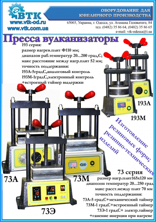 Предназначен для изготовления изделий из различных видов сырья каучуковых и силиконовых резин. Может использоваться в машиностроении, стоматологии, а также в ювелирной промышленности для изготовления резиновых форм для восковых моделей. Имеет цифровой контроллер температуры и механический таймер времени. Технический паспорт Вы можете скачать на сайте.
