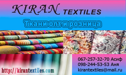 Интернет магазин тканей "Кirantextiles" представляет огромный ассортимент недорогих, качественных искусственных тканей производства Китая, Кореи и Турции. У нас вы можете заказать ткань от 1 метра, а заказывая от 10 и 30 метров каждого материала, вы гарантированно получаете СКИДКУ! В наличии имеются ткани: креп (масло трикотаж, сатин, шифон), гипюр (на атласе, стрейч, не стрейчевый), атлас (горох, принт, стрейч, не стрейч), трикотаж (леопард, французский, принт), ткань копейка и многие другие. Доставка по всей Украине, при необходимости высылаем каталог с образцами тканей. Посмотреть весь ассортимент товара и сделать заказ вы можете на нашем сайте kirantextiles.com или звоните по телефонам +38(098)-244-53-53 Аня, +38(067)-257-32-70 Асиф.